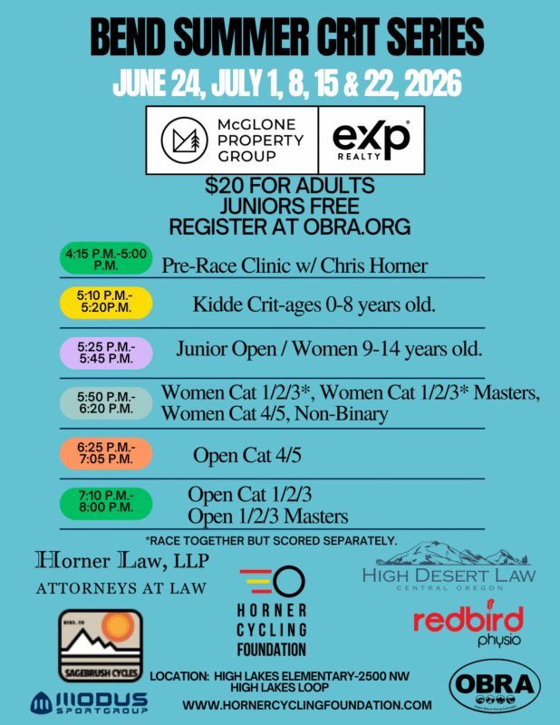 - Register online at OBRA.org by 5:00 p.m. Tuesday before race day. Day of registration begins at 3:00 p.m. under the OBRA tent at High Lakes Elementary School.